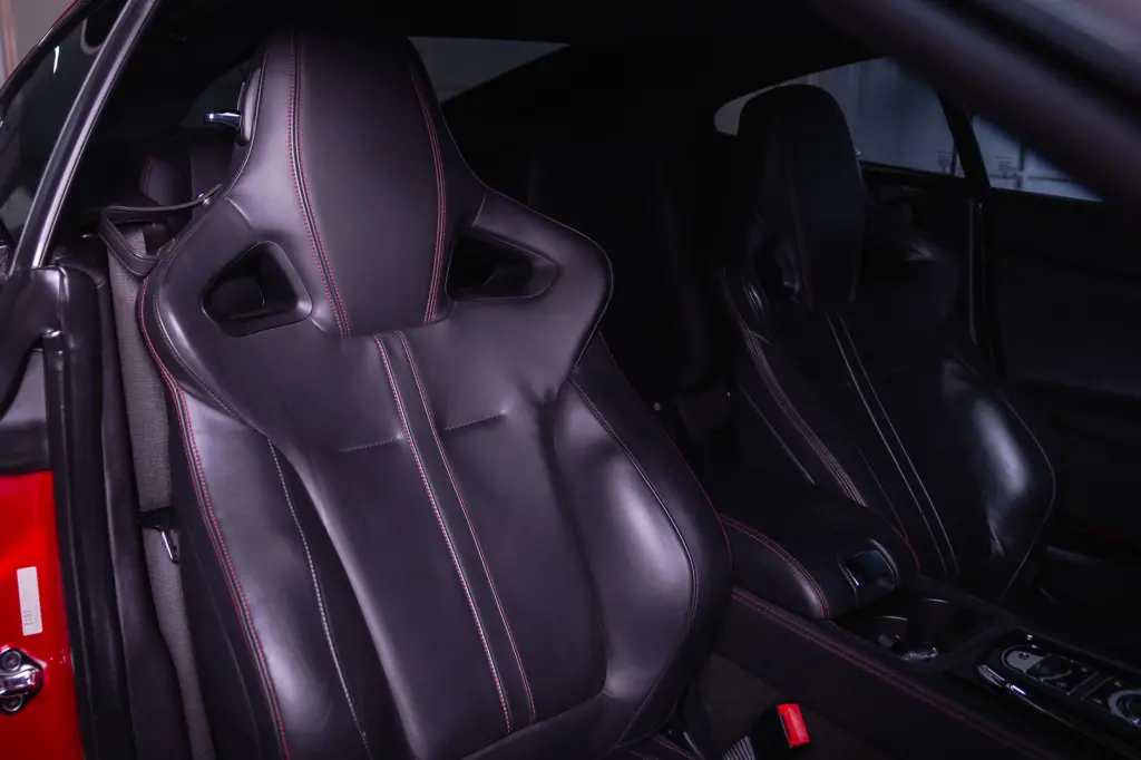INTERIOR: ACABAMENTO LUXUOSO EM COURO (FREQUENTEMENTE COM COSTURAS CONTRASTANTES), DETALHES EM CARBONO OU MADEIRA, E FORRO DO TETO EM SUEDE OU ALCANTARA.