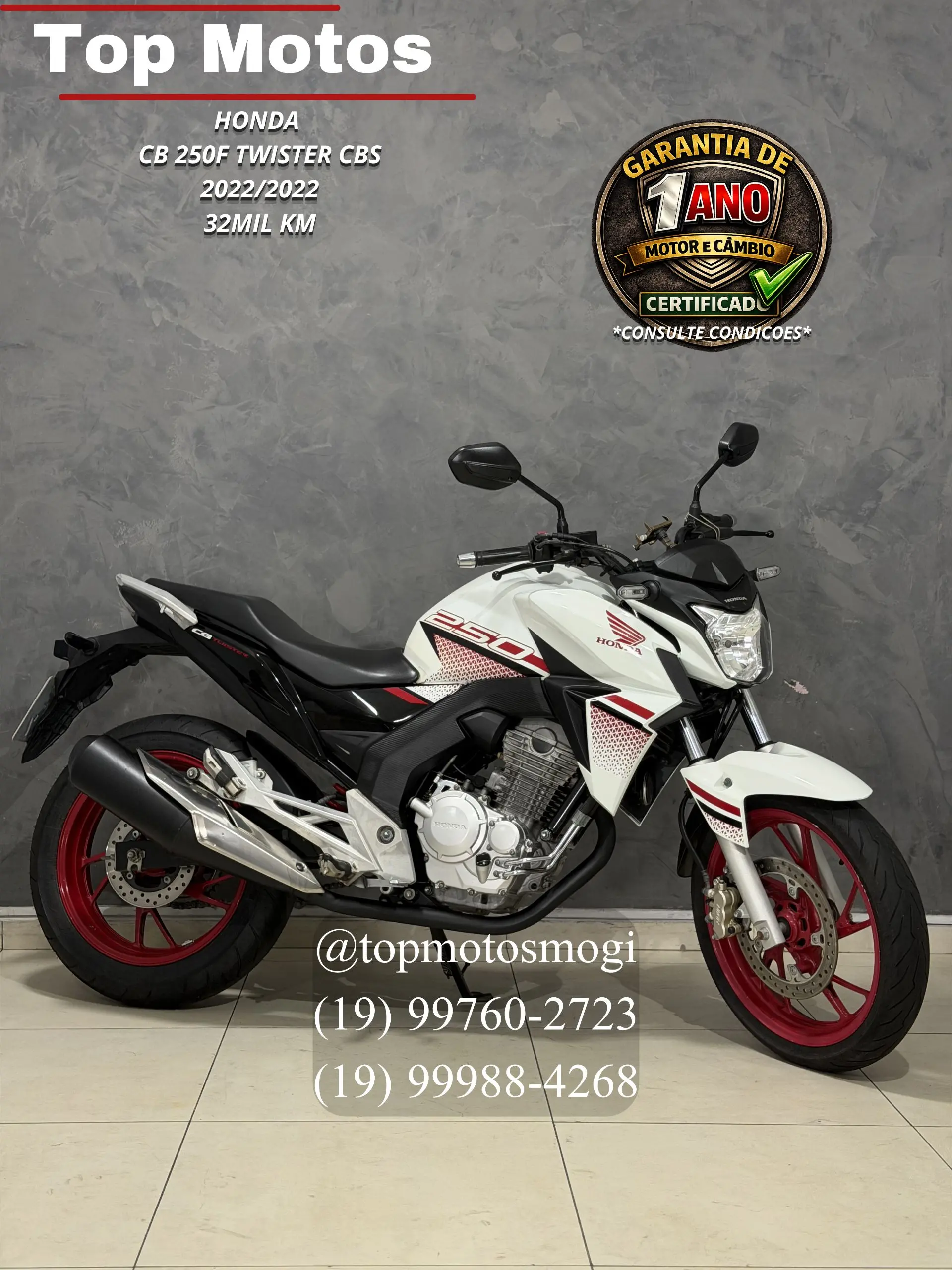 -20222022 -32mil km -garantia motor e cambio de 1 ano consulte condicoes -pegamos sua moto de menormaior valor em negocio!!entre em contato para melhores informacoes. -financiamento em ate 48x -cartao de credito em ate 21xmediante cotacao, solicite uma simulacao sem compromisso!! vendedores @oliveiraotavio.35 19 99760-2723 @big.jhoo53 19 99988-4268 twister 250 2022 motor 249cc monocilindrico, agil e com bom desempenho na cidade e estrada estilo naked esportivo, pilotagem confortavel e excelente custo-beneficio